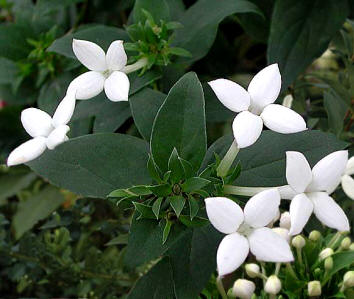 Las flores son de color blanco, rosa o rojo, muy perfumadas y reunidas en corimbos terminales, con la corola larga y tubular y cinco pétalos en forma de estrella. Se parecen bastante a las del jazmín pero son más duraderas.