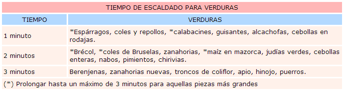 En la siguiente tabla se indica el tiempo de escaldado según el tipo y tamaño de las verduras:
