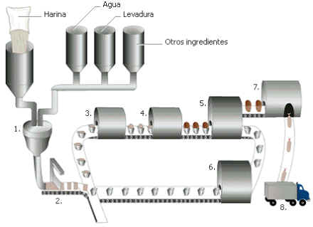 Elaboración industrial de pan: El proceso industrial de elaboración del pan suele constar de 8 pasos: 1) Los cereales, la levadura, el agua y otros ingredientes se mezclan para formar la masa. Posteriormente esta mezcla se amasa y se deja en reposo durante unas horas para que fermente; de esta manera, la levadura libera diminutas burbujas de dióxido de carbono que incrementan el volumen de la masa haciéndola más ligera y porosa; 2) Una máquina va cortando la masa en porciones más pequeñas y las deposita en un recipiente; 3) Las porciones van pasando por zonas de temperatura y humedad controlada para que el pan crezca por segunda vez; 4) Se cuece el pan en el horno; 5) Los recipientes se separan del pan; 6) Los recipientes vacíos son conducidos por una cinta transportadora hasta un lavavajillas; 7) Las porciones de pan ya frío se cortan y se envuelven; 8) El pan se introduce en camiones que lo reparten en las tiendas para su venta.