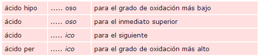 Al nombre abreviado del elemento central X se le antepone la palabra ácido y se le hace terminar en -oso o en -ico, según que dicho elemento actúe con el índice de oxidación menor o mayor respectivamente. Esta regla, que es válida únicamente para el caso de que el elemento posea dos diferentes grados de oxidación positivos, puede extenderse al caso de que tenga cuatro, sin más que combinar los prefijos hipo- y per- con los sufijos -oso e -ico de la siguiente manera: