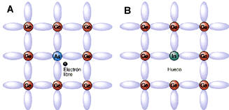 Cuando se dopa un cristal semiconductor con una impureza del grupo V (figura A), que tiene 5 electrones de valencia, este átomo ocupa el lugar de uno de silicio, estableciendo cuatro enlaces con sus átomos vecinos. Pero queda un quinto electrón libre, que se puede desplazar por toda la estructura cristalina. Si en cambio se dopa el cristal con una impureza del grupo III (figura B), faltará un electrón para completar la estructura. El hueco que se forma, permite el movimiento de electrones hacia él. Estos electrones crearán a su vez más huecos en el lugar de la estructura donde se encontraban anteriormente. El efecto puede considerarse como el de un hueco que viaja por el cristal.